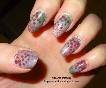 I did my first sponge gradient since grade school, and it was pretty fun. I used a base of Avon's "Urban Grey" - I wanted a white that wasn't "in your face" bright, and this suited nicely. For the gradients, I used Essie's "Angora Cardi" and Revlon's "Spanish Moss" - gorgeous together, don't you think?
